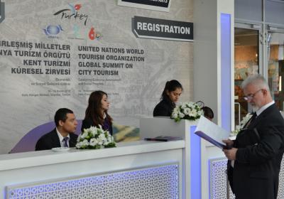 Ректорот Аце Миленковски на регистрацијата, пред започнувањето на седницата на самитот за Градски туризам во Истанбул