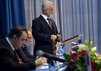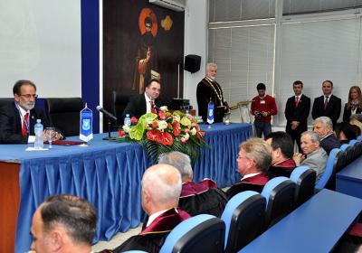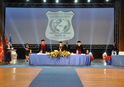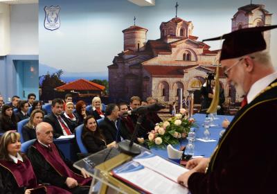 Ректорот Миленковски ја чита Одлуката за доделување на титулата DOCTOR HONORIS CAUSA на Универзитетот за туризам и менаџмент во Скопје